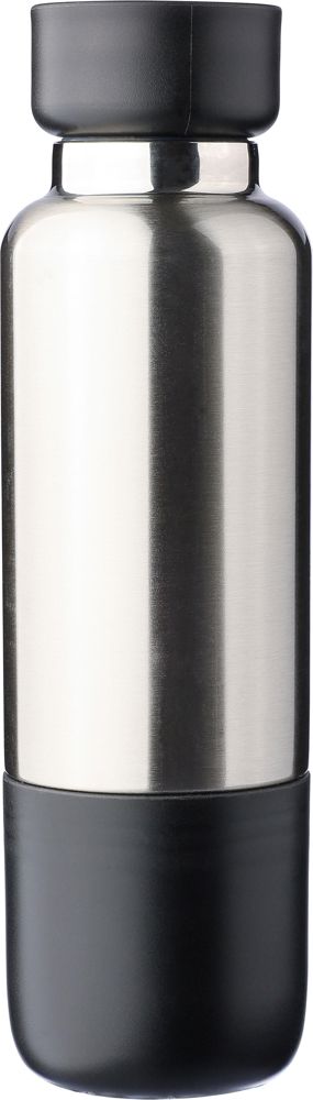 Gourde double paroi en acier inoxydable d'une contenance de 500 ml avec intérieur en acier inoxydable 304 et extérieur en acier inoxydable 201. Elle est équipée d'un couvercle à vis en PP avec compartiment en AS transparent, d'une dragonne et d'une sangle de transport interchangeables en polyester, et d'un gobelet en PP de 200 ml à sa base. Corps argenté avec attributs mats. Emballée individuellement dans une boîte cadeau en kraft.